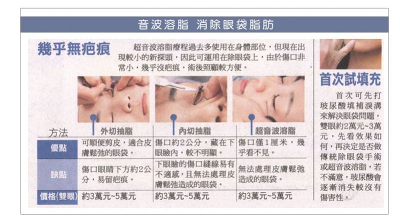 但是,音波溶脂并没有办法处理皮肤松弛的造成的眼袋,因此因年老造成的松弛型眼袋还是会建议使用内开/外开式的眼袋手术。