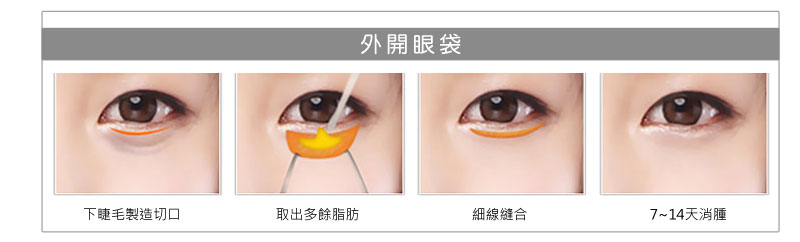 外开手术手术,适合严重松弛或是眼部组织下垂的患者,手术方式是由从下睫毛下方制造微细开口,取出多余脂肪,再同时将松弛的肌肤一并提拉处理。
