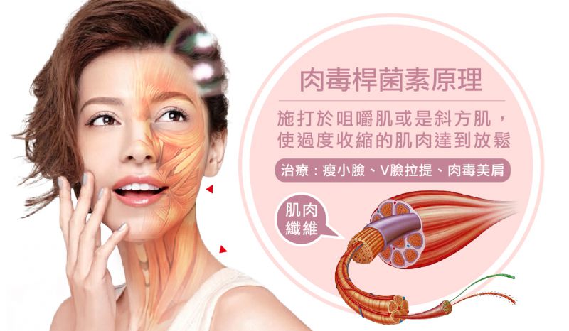 肉毒杆菌素(Botulinum Toxin)一般用于除皱、抬头纹、鱼尾纹、瘦肩。肉毒杆菌素(Botulinum Toxin),是由肉毒杆菌( Clostridium Botulinum )所提炼出的一种蛋白质神经毒素。为一种神经传导的阻断剂,可使过度收缩的肌肉松弛,进而使动态皱纹消失。它作用在神经与肌肉或腺体的接合处,使肌肉放松或抑制腺体分泌。注射后可以阻断神经与肌肉之间的神经传导物质(乙醯胆碱),达到抑制肌肉的目的。