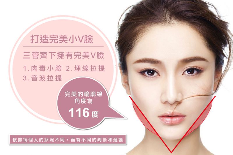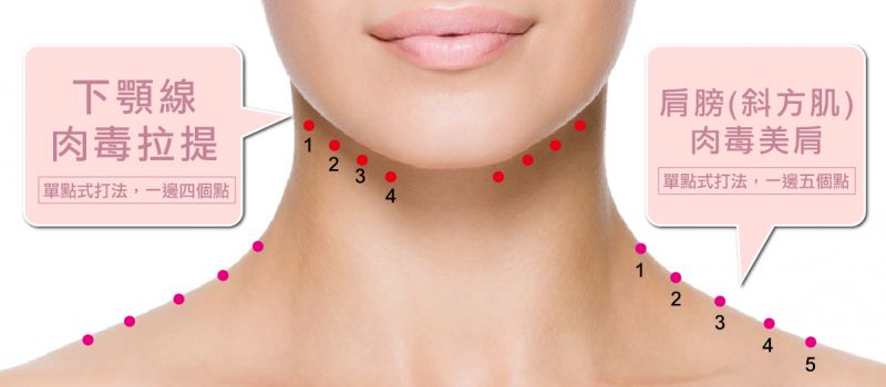 把肉毒微针注射在两侧下颚线缘(下巴线)及上颈部,以放松扩颈肌(platysma muscle)的下拉力量一并改善下脸颊松垮现象可达到颈部紧实、下巴线条变明显而年轻的效果。